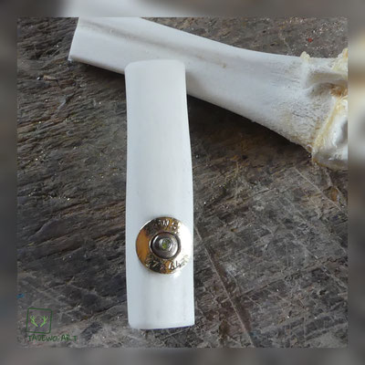 Wir haben uns für einen Hutpin aus einem Teil des Knochens entschieden. Der Hülsenboden wurde der Form des Knochens angepasst und auf der Vorderseite befestigt. Veredelt wurde der Hülsenboden durch einen kleinen Stein in jagdlichem Grün.